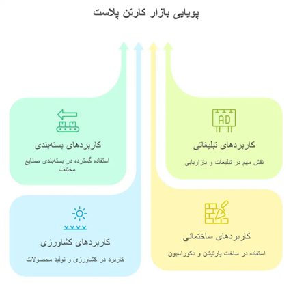 بازار کارتن پلاست به دلیل گستردگی و تنوع بالای مشتریان، یکی از پویاترین بازارهای صنایع پلیمری به شمار می آید. این محصول به دلیل ویژگی های منحصر به فردی که دارد، در صنایع گوناگون مورد استفاده قرار می گیرد. از صنایع بسته بندی که به دنبال محصولی مقاوم، سبک و قابل چاپ هستند گرفته تا تبلیغات محیطی و استندهای نمایشگاهی که نیازمند ورق هایی با کیفیت چاپ بالا و دوام طولانی می باشند، همگی بخش مهمی از مشتریان بالقوه این بازار محسوب می شوند. علاوه بر این، کشاورزی و گلخانه ها با استفاده از ورق های کارتن پلاست برای پوشش گیاهان یا ساخت تجهیزات سبک، و همچنین طراحی داخلی و صنعت ساختمان در اجرای پارتیشن ها و سازه های موقت، سهم چشمگیری در تقاضای این محصول دارند.